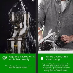 The filter of the juicer is carefully designed. Prevents build-up of residues, so you only need to rinse under running water. With no sharp blades, the filter is not only easy to clean but also safe to operate.