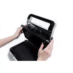 - An interlocking system ensures the grill stays closed, with plates that securely snap into place and can be removed with the push of a button
