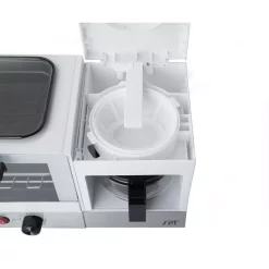 SPT 3-in-1 Breakfast Maker combines all the breakfast necessities into one: Toaster Oven, Coffee Maker and Oven-Top Griddle. The new white cabinet with stainless steel control panel gives it a modern and sleek look. This is the perfect compact appliance for dorms, offices, RVβs, studios or wherever space is limited. You can brew a fresh cup of coffee, toast couple slices of bread and fry up an egg all at once.