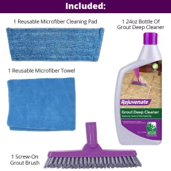 Never clean grout on your hands and knees again when you use the Rejuvenate Ultimate Grout Deep Cleaner System. It is safe for the environment and the perfect cleaning kit for all unsealed grout, tile floors and walls. This grout cleaner instantly removes years of dirt build-up from all tile and grout surfaces, including sanded, non-sanded and epoxy grout. The complete tile and grout care system removes years of dirt, stains and grime over time to make your grout and tile surfaces look new again. Easy to use, simply pour the Grout Deep Cleaner on your tile floors, scrub with the adjustable handle grout brush, wipe clean with the microfiber towel then damp mop with the included plush microfiber mop. This system includes: 24 oz. grout deep cleaner, adjustable screw-on grout brush, super strong 47 in. extension pole, plush mop, microfiber cleaning pad and free bonus 16 in. x 16 in. microfiber cleaning towel.
